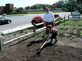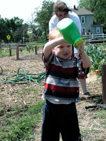 We FINALLY got our garden planted. It rained and rained and rained for weeks so we weren’t able to get anything planted and now that we do have it planted, it refuses to rain even a tiny bit. This is the second year we have had our garden. This year we planted corn, carrots, peas, beans, tomato plants, echinacea, salvia, and marigolds. Liam and Colm had a great time planting and digging, but Colm had more fun once it was time to water. He watered himself more than he watered the plants, but atleast it kept him busy. I should also mention that without the help of my mom, this garden would have never happened…she is the greenthumb and I am her apprentice.