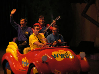 We went and saw the Wiggles tonight. I’m not sure who had more fun-Sean and I or the kids. Liam woke up bright and early this morning and had his red shirt in hand. He wanted to wear a red shirt like Murray. He wanted the rest of us to dress accordingly as well. Luckily, I don’t have a yellow shirt and Colm doesn’t have a purple shirt, so we were off the hook. Once we got there, it took Colm a little while to figure out what was going on, but once he stopped watching the big screens and realized that Murray, Jeff, Anthony and Greg were right there, he wouldn’t stop waving to them. It was too cute. He just kept waving and saying, “hi, hi, hi.”