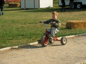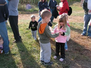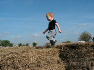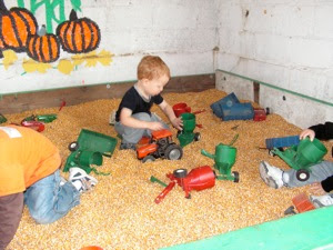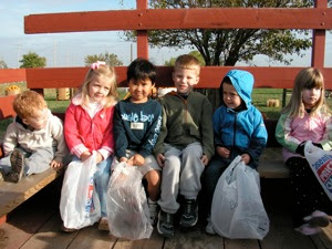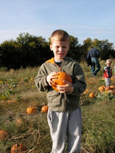 Liam and some of his classmates riding on the wagon to go get their pumpkins.