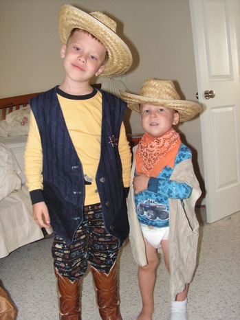 We weren’t planning on being cowboys for Halloween, but the boys found a bunch of props and costumes I used for a play my class did about seven years ago when I was still teaching. They found boots, vests, sheriff badges and all the cowboy essentials. I am not sure if they really want to be cowboys for Halloween or not, but they sure did look cute.