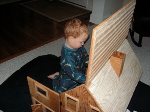 My aunt made me this dollhouse and all of the furniture in it when I was little. I haven’t played with it since I was probably eight years old. It was in my dad’s attic for about 23 years and then in our basement for the past three years. It was dirty and dusty and some of the furniture had broken because the glue dried up and stopped working. I had told Liam he could play with it someday and I had kind of forgotten about it when Sean reminded me the other day that it was in our basement. Well, I dragged it out of the basement yesterday and the boys helped me dust it. They have only broken one thing so far (a porcelain pedestal sink) and they really seem to enjoy playing with it. We do need to get some more furniture though and maybe a few more people to live in the house.