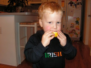 …eat them! Colm loves lemons. He has figured out where they are at the grocery store so we have to buy one every week. He likes to have them cut up and then he walks around the house sucking on them. If we go out to eat and we get lemon in our tea or water, Colm will fish the lemon out before you have a chance to help him. (We are trying to get used to having a little hand submerged in our beverages.)