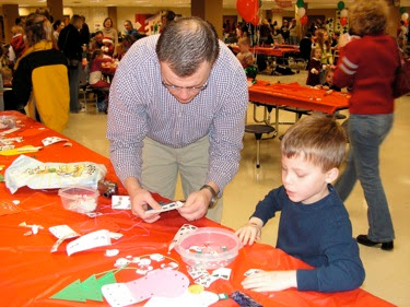 Today was our church’s Christmas Family Festival. First, we went and talked to Santa. Liam had a list for him which included two walking hands (it’s a Halloween toy he saw in a catalog) and a truck. Colm was not happy about sitting with Santa, so we made it a family portrait instead of just the boys.