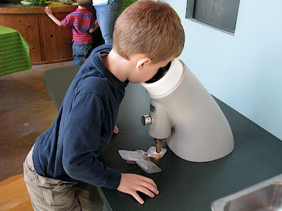 Looking at owl feathers, insects wings, rabbit hair and some other things up close.