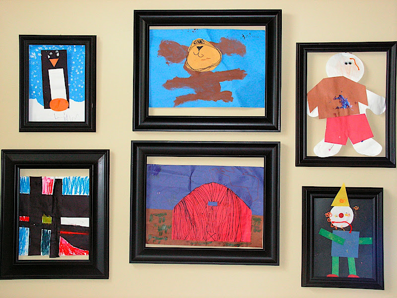 I am getting tired of blank walls and I am also getting tired of not having anywhere to display the boys’ masterpieces. So, today I went to Hobby Lobby and bought these frames (they don’t have any glass in them) that happened to be 50% off. I had the guy in the framing department put the sawtooth hanging things on the back so they can be hung either horizontally or vertically so I can change our little gallery as needed. These little pieces of art can be found in our playroom.